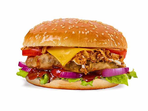 Большая булочка с кунжутомкотлета мяснаясалат листовойлук красныйпомидорсыр Хохландлук фрисоус сеульскийсоус трюфельный