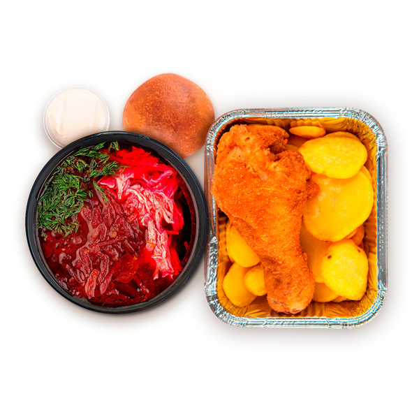 Борщ горячий Сметана Картофель Ножка куриная Булочка