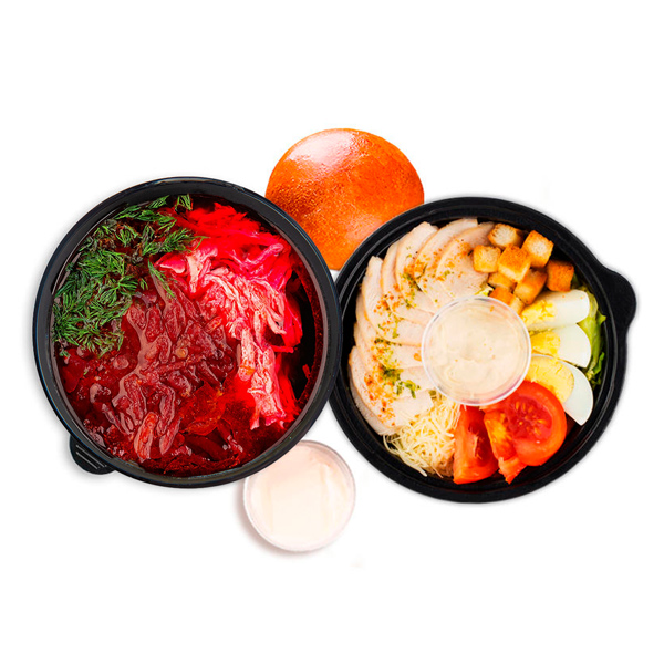 Борщ горячий Бульон куриный натуральный Филе куриное Картофель Свекла Морковь Лук Зелень Продукт Сметанный Сметана Продукт сметанный Цезарь с курицей Салат Помидор Яйцо Филе куриное фри Сыр пармезан Сухарики Соус Булочка Булочка свежеиспеченная
